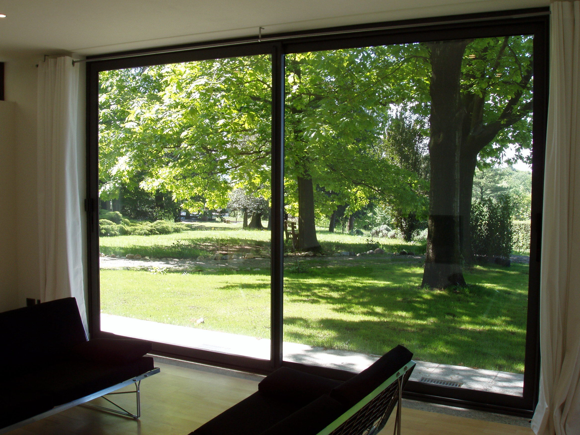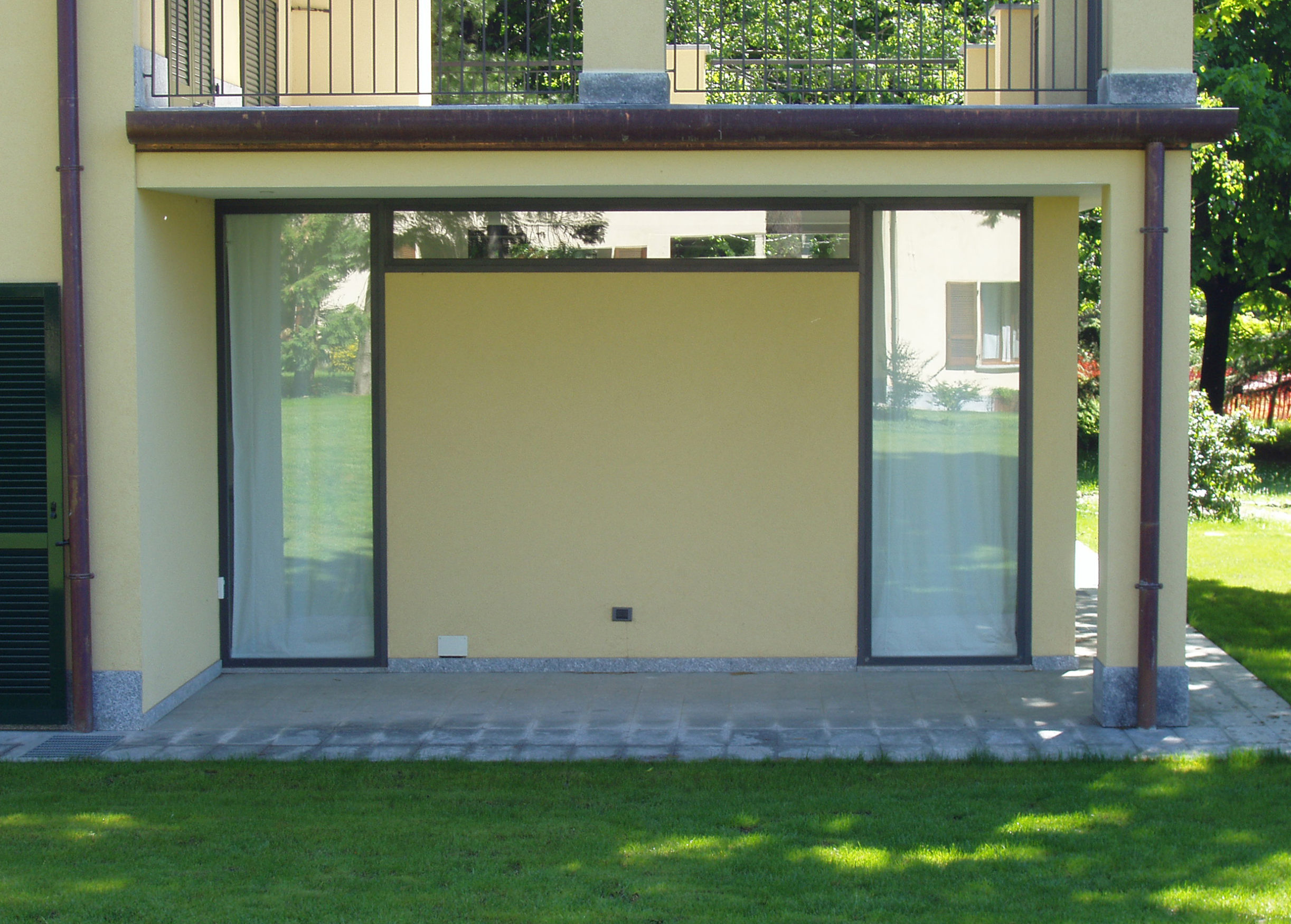 Casa Moorsolo liegt auf einem kleinen Hügel in einer Feriensiedlung im Norden Italiens. Ein Teil des Erdgeschosses wurde durch den Anbau eines modernen Wohnkubus ergänzt und somit als Gästehaus mit zwei eigenständigen Schlaf- und Badeinheiten nutzbar gemacht. Die Schlaf- und Badezimmer befinden sich im Altbau und werden über einen fassadenseitigen Flur rechts und links des Neubaus erschlossen. Eine Terrasse im 1.OG spendet dem Wohnraum durch einen großzügigen Überstand Schatten. Der Wohnraum öffnet sich mit einem Panoramafenster zu der nicht einsehbaren Seite nach Norden. Im Westen und Osten ist die Fassade geschlossen gehalten und über ein Spiel horizontaler und vertikaler Bandfenster von den Nachbarn aus einsehbar.