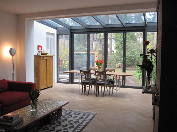 Sanierung und Umbau des unter Denkmalschutz stehenden Wohnhaus von Julius Leber und seiner Familie während der zeit des 2. Weltkrieges (1938-1945) Das Reihenendhauses wurde 1926 von Hugo Hering geplant und als erstes Haus der Onkel-Tom-Siedlung nach dem MAsterplan von Bruno Taut errichtet. Für eine vierköpfige Familie wurde der Grundriss neu organisiert. Das Erdgeschoss konnte in Abstimmung mit dem Denkmalamt durch den Anbau eines Wintergartens erweitert werden, welcher sich durch Auffaltung von vier Türen vollständig zum Garten öffnen lässt. Darüber hinaus erweitert sich der Wohnraum in den hierzu offenen Keller und über das Treppenhaus in ein geöffnetes Dachgeschoss. Die drei originalen Schlafzimmer wurden in ihrer Kubatur beibehalten. Insgesamt verfügt das Haus über drei Bäder.