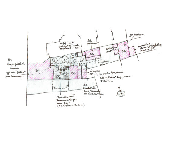 Die Anordnung der Gebäude entspricht im Wesentlichen der des Masterplanes, der auf der Zusammenführung der Entwürfe der Kollektive Collein und Dutschke/Kaiser basiert. In Anlehnung an die Idee der Stadtlandschaft der 1950er Jahre entstehen fließende landschaftliche Strukturen in bewusstem Gegensatz zur rechtwinkligen Anordnung der Wohnblöcke. Auf dieser städtebaulichen Grundlage wurde ein vertieftes Grünkonzept entwickelt, welches eine luftige, parkartige Gehölzstruktur und Spielplätze in freien Formen zeigt.