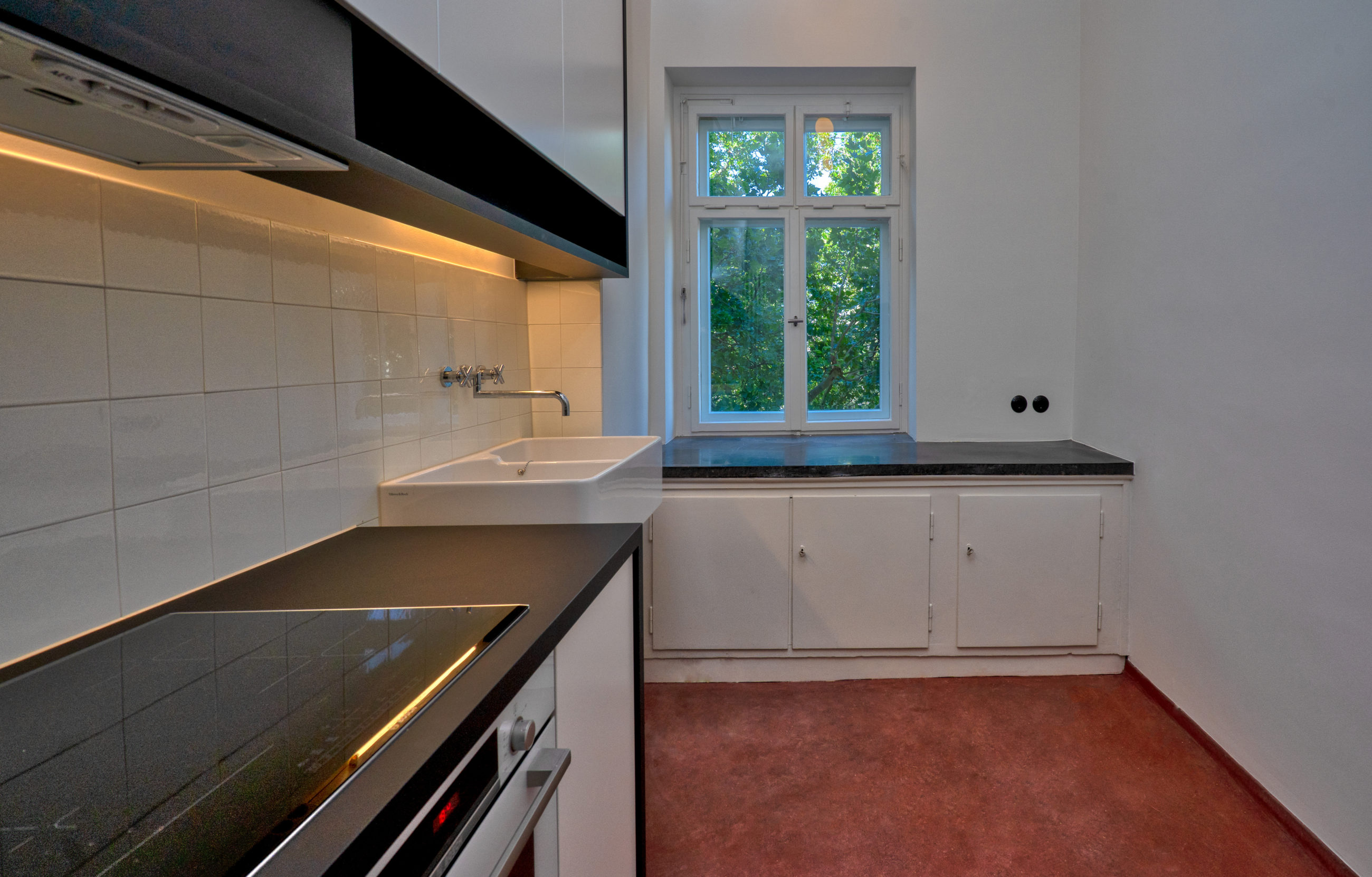 Die Wohneinheit wurde in Abstimmung mit dem Landesdenkmalamt modern interpretiert rekonstruiert und spiegelt beispielhaft die Qualität und Ausstattung der damaligen Wohnverhältnisse wieder. Die originalen Bodenbeläge wurden aufgearbeitet und bestehende Einbaumöbel instand gesetzt und saniert. Die Objekte in Bad und Küche wurden in Anlehnung an historische Fotos ausgewählt.